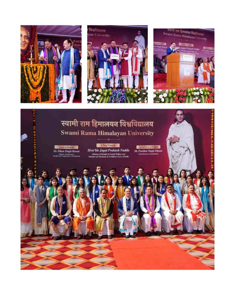 देहरादून। जॉलीग्रांट स्थित स्वामी राम हिमालयन विश्वविद्यालय के आठवें दीक्षांत समारोह में केंद्रीय स्वास्थ्य एवं परिवार कल्याण तथा रसायन एवं उर्वरक मंत्री जगत प्रकाश नड्डा मुख्य अतिथि और उत्तराखंड के मुख्यमंत्री पुष्कर सिंह धामी विशिष्ट अतिथि के रूप में शामिल हुए। समारोह में विभिन्न संकायों के 1001 छात्र-छात्राओं को डिग्रियां प्रदान की गईं।