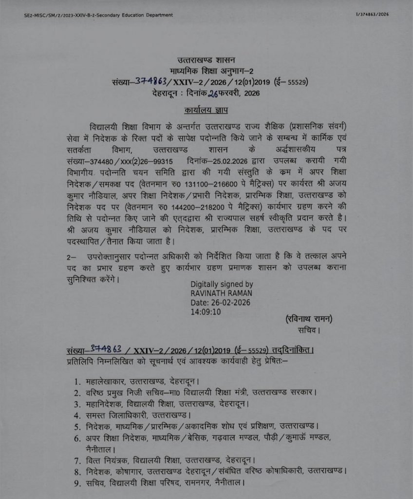 देहरादून।। उत्तराखण्ड शासन के विद्यालयी शिक्षा विभाग में प्रशासनिक स्तर पर महत्वपूर्ण पदोन्नतियां की गई हैं। जारी आदेश के अनुसार अपर शिक्षा निदेशक/प्रभारी निदेशक (प्रारम्भिक शिक्षा) के पद पर कार्यरत श्री अजय कुमार नौडियाल को निदेशक, प्रारम्भिक शिक्षा, उत्तराखण्ड के पद पर पदोन्नत किया गया है। उन्हें वेतनमान ₹1,44,200–2,18,200 (पे मैट्रिक्स) में कार्यभार ग्रहण करने की तिथि से पदोन्नति प्रभावी होगी तथा उसी पद पर पदस्थापित किया गया है।