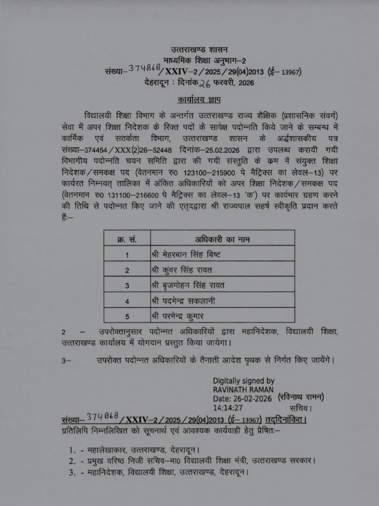 इसके अतिरिक्त राज्य शैक्षिक (प्रशासनिक संवर्ग) सेवा में अपर शिक्षा निदेशक के रिक्त पदों पर संयुक्त शिक्षा निदेशक/समकक्ष पद पर कार्यरत श्री मेहरबान सिंह बिष्ट, श्री कुंदर सिंह रावत, श्री बृजमोहन सिंह रावत, श्री पदमेन्द्र सकलानी तथा श्री परमेन्द्र कुमार को अपर शिक्षा निदेशक पद पर पदोन्नत किया गया है। इन सभी अधिकारियों की पदोन्नति कार्यभार ग्रहण करने की तिथि से प्रभावी होगी।