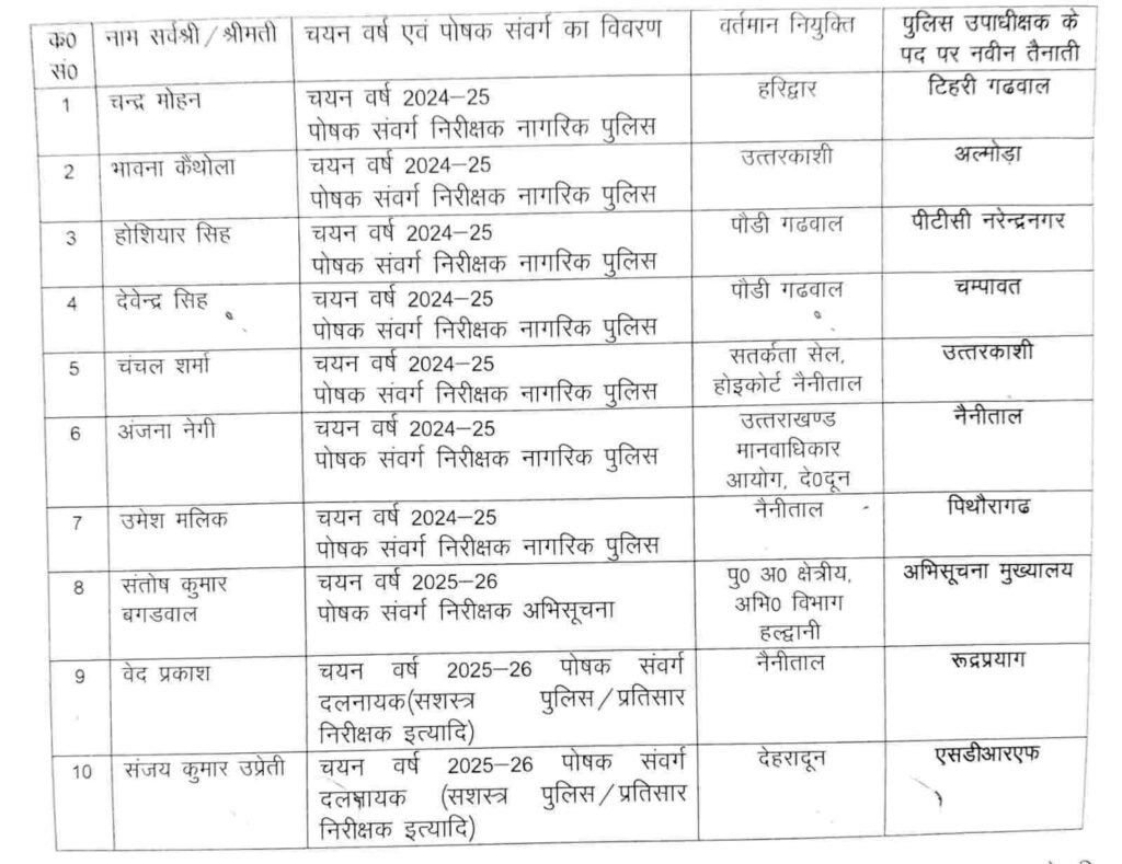 उत्तराखंड पुलिस में बड़ा प्रमोशन: 10 निरीक्षक बने उपाधीक्षक, कई अधिकारियों के तबादले