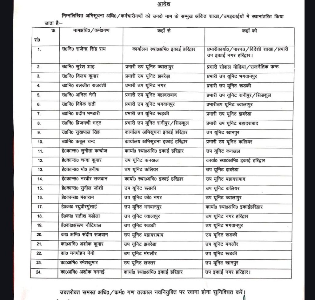 हरिद्वार। आगामी कुंभ मेला एवं चुनाव को दृष्टिगत रखते हुए जनपद की सुरक्षा व्यवस्था को और अधिक सुदृढ़ करने के उद्देश्य से एसएसपी हरिद्वार द्वारा खुफिया तंत्र विभाग में बड़ा बदलाव किया गया है। इस क्रम में जनपद हरिद्वार में तैनात अभिसूचना/खुफिया विभाग के अधिकारियों एवं कर्मचारियों के कार्य क्षेत्र में परिवर्तन करते हुए स्थानांतरण आदेश जारी किए गए हैं।