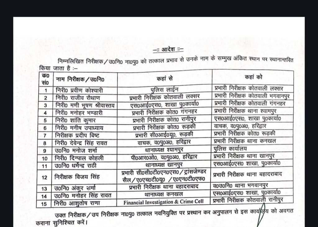 हरिद्वार। वरिष्ठ पुलिस अधीक्षक हरिद्वार द्वारा बड़ा फेरबदल किया गया है। जनपद हरिद्वार में तैनात 15 निरीक्षक एवं उपनिरीक्षकों का तत्काल प्रभाव से स्थानांतरण किया गया है।