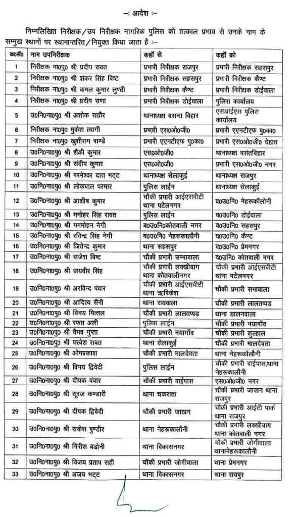 देहरादून में पुलिस में बड़ा फेरबदल, कई निरीक्षक व उपनिरीक्षक किए गए स्थानांतरित