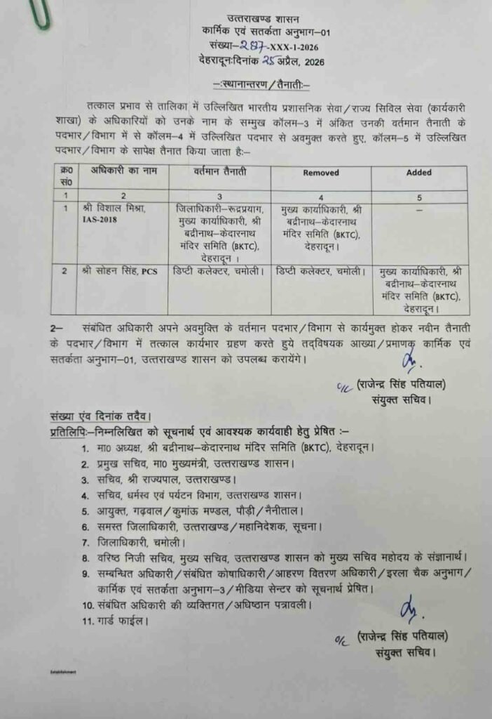देहरादून। उत्तराखण्ड शासन के आदेशानुसार उपजिलाधिकारी कर्णप्रयाग, जनपद चमोली श्री सोहन सिंह रांगड (PCS) को श्री बद्रीनाथ-केदारनाथ मंदिर समिति (BKTC) का मुख्य कार्याधिकारी (CEO) नियुक्त किया गया है। इस नियुक्ति को प्रशासनिक दक्षता के साथ धार्मिक व्यवस्थाओं को मजबूत करने की दिशा में महत्वपूर्ण कदम माना जा रहा है।