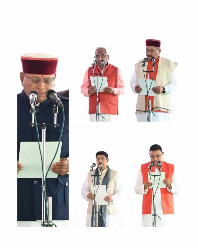 मुख्यमंत्री पुष्कर सिंह धामी की उपस्थिति में खजान दास, मदन कौशिक, भरत सिंह चौधरी, प्रदीप बत्रा और राम सिंह कैड़ा को मंत्री पद की शपथ दिलाई गई।