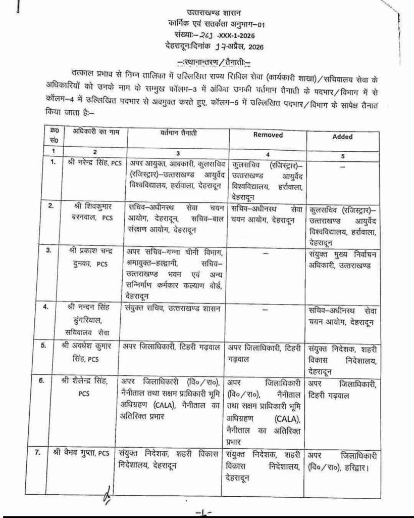 उत्तराखंड शासन ने जारी की अधिकारियों के तबादलों की सूची