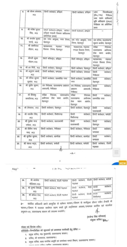 इसके अलावा विभिन्न जिलों में तैनात अधिकारियों के भी बड़े स्तर पर तबादले किए गए हैं। हर गिरि को देहरादून से हरिद्वार, अनुराग आर्य को चम्पावत से नैनीताल, रविन्द्र कुमार जुवांठा को ऊधमसिंह नगर से देहरादून भेजा गया है। सुधीर कुमार को प्रशासन अकादमी से नैनीताल, हिमांशु कफल्टिया को ऊधमसिंह नगर, प्रेमलाल को उत्तरकाशी, और मुकेश चन्द्र रमोला को देहरादून में नई जिम्मेदारी दी गई है।