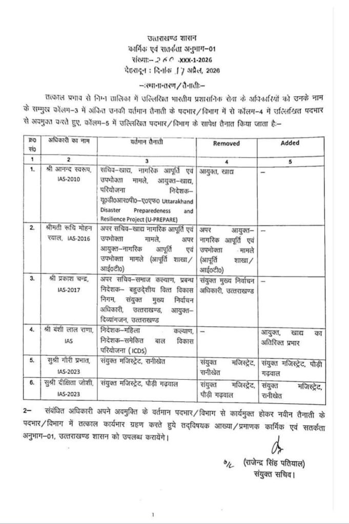 खाद्य एवं नागरिक आपूर्ति विभाग में आनन्द स्वरूप को सचिव के साथ आयुक्त खाद्य का दायित्व दिया गया है, जबकि रुचि मोहन रयाल को अपर सचिव के साथ अपर आयुक्त बनाया गया है। प्रकाश चन्द्र को समाज कल्याण से हटाकर संयुक्त मुख्य निर्वाचन अधिकारी की जिम्मेदारी दी गई है। बंशी लाल राणा को निदेशक महिला कल्याण के साथ आयुक्त खाद्य का अतिरिक्त प्रभार सौंपा गया है।