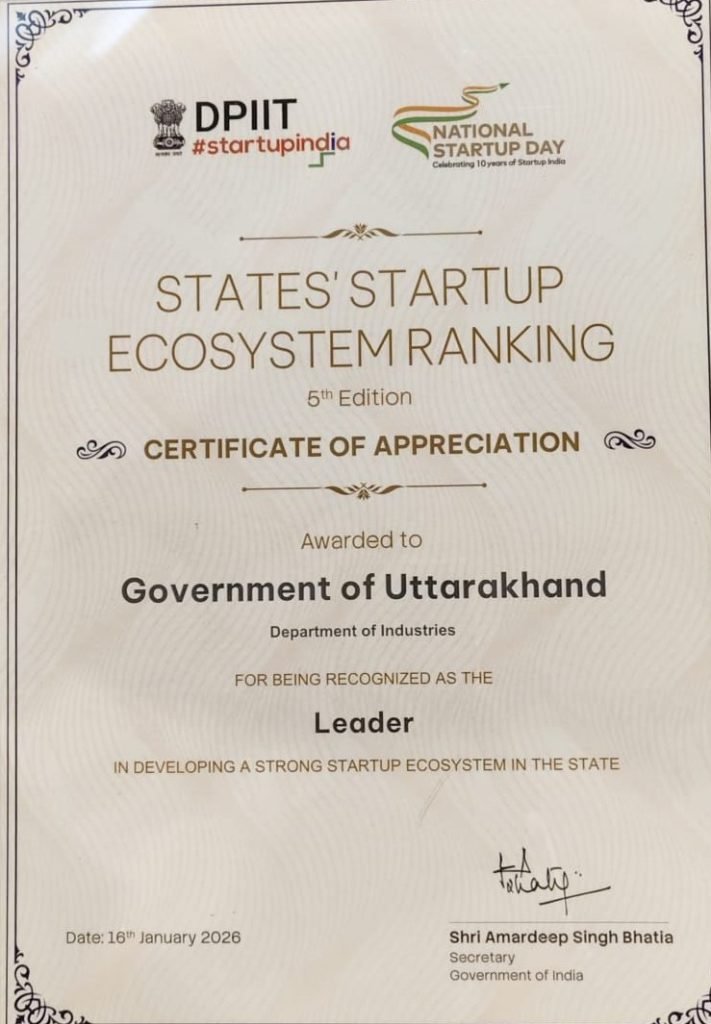 इस उल्लेखनीय उपलब्धि के लिए राष्ट्रीय स्टार्टअप दिवस के अवसर पर उत्तराखण्ड सरकार के उद्योग विभाग को Certificate of Appreciation से सम्मानित किया गया। यह सम्मान इस बात का प्रमाण है कि उत्तराखण्ड ने अपनी प्रभावी स्टार्टअप नीति के माध्यम से नवाचार, उद्यमिता, निवेश प्रोत्साहन और युवाओं को स्वरोजगार से जोड़ने की दिशा में उल्लेखनीय प्रगति की है।