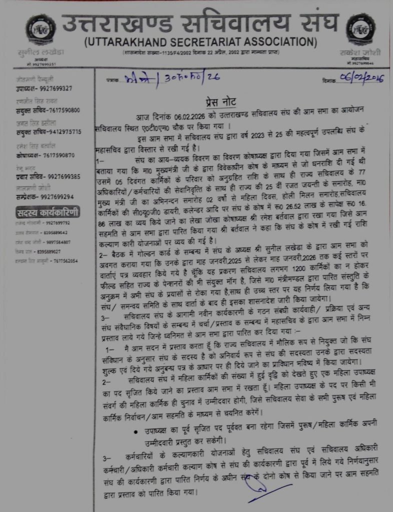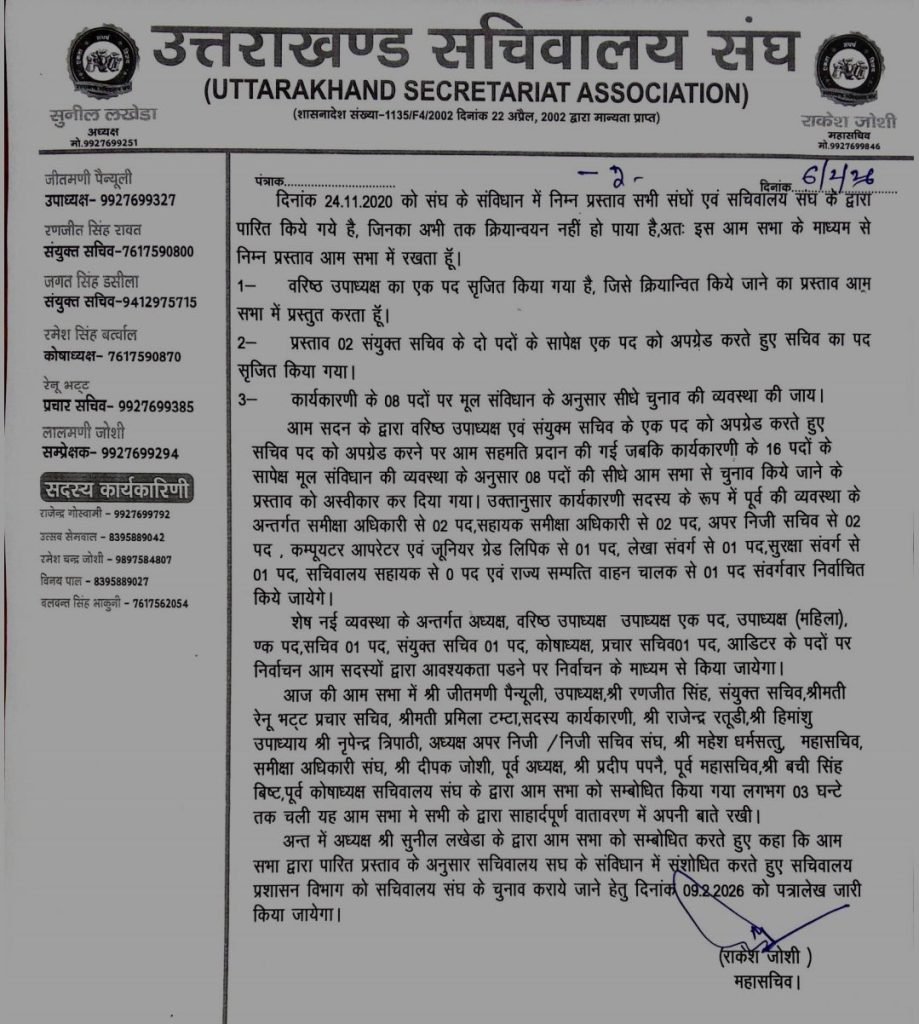 आम सभा में वरिष्ठ उपाध्यक्ष का एक पद सृजित किए जाने, संयुक्त सचिव के पदों के सापेक्ष सचिव पद को अपग्रेड करने, तथा कार्यकारिणी के पदों पर मूल संविधान के अनुरूप चुनाव व्यवस्था पर विचार किया गया। चर्चा के दौरान कार्यकारिणी के ढांचे, पदों की संख्या और विभिन्न संवर्गों के प्रतिनिधित्व से जुड़े विषयों पर सदस्यों ने अपने विचार रखे। आम सभा ने बहुमत से कुछ प्रस्तावों पर सहमति प्रदान की, जबकि कुछ प्रस्तावों को अस्वीकार भी किया गया।